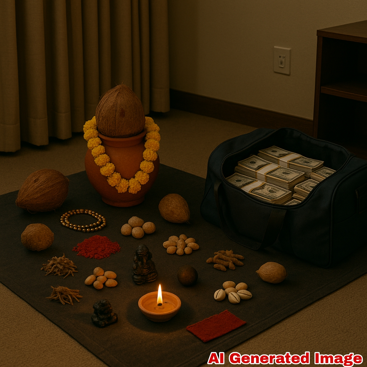 पोलिसांनी दिलेल्या माहितीनुसार खोलीत विविध जादूटोण्याचे साहित्य सापडले. त्यामध्ये काळी पावडर, मंत्र लिहिलेले कागद, काळे-लाल कापड, शेंदूर लावलेल्या पुड्या, कवड्या, वाळलेले लिंबू, हारतुरे यांचा समावेश होता. आरोपींचा हेतू चार लाख रुपये घेऊन तीन कोटी रुपयांचा ‘पैशांचा पाऊस’ पाडण्याचा होता.