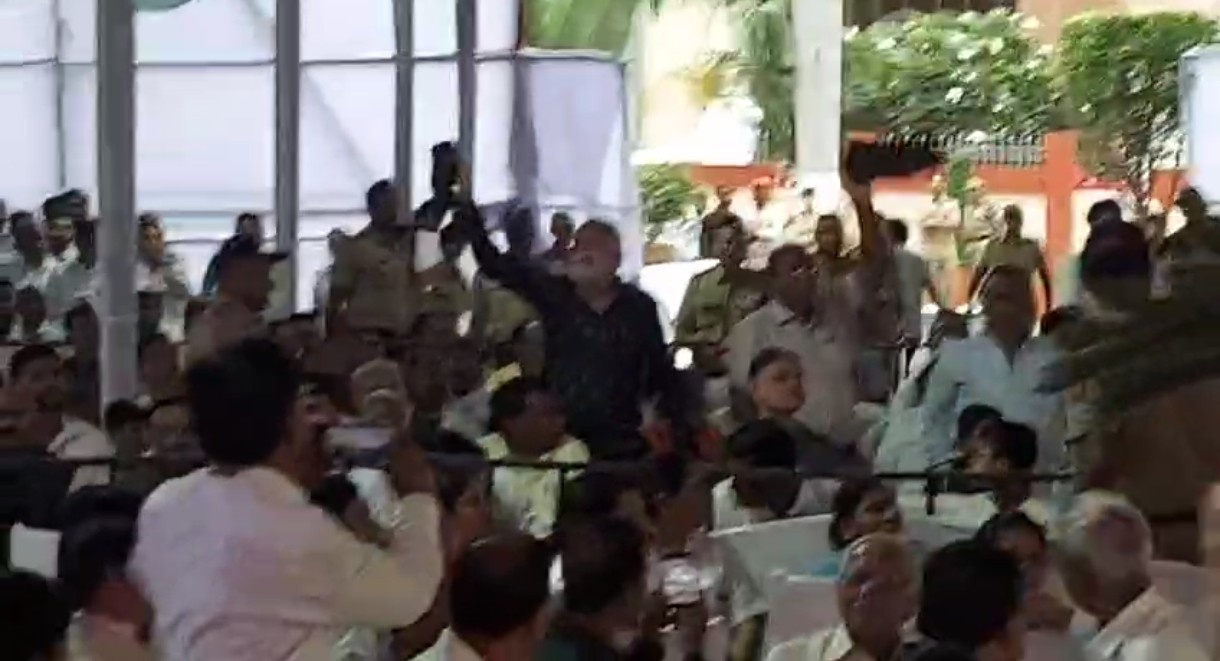 राम पेरकर यांच्यासह काही जणांनी जागेवरूनच घोषणाबाजी सुरू केली. यामुळे काही काळ वातावरण तंग झाले. पोलिसांनी तातडीने हस्तक्षेप करत सर्व कार्यकर्त्यांना ताब्यात घेतले. या घटनेमुळे कार्यक्रमात क्षणभर गोंधळाचे वातावरण निर्माण झाले. मात्र, पोलिसांच्या सतर्कतेमुळे मोठा अपघात टळला.