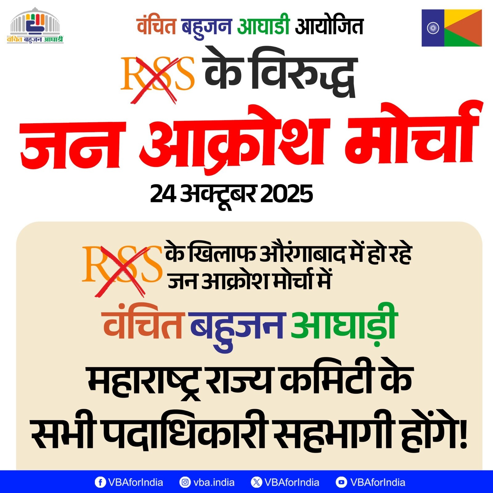 या पार्श्वभूमीवर वंचित बहुजन आघाडीच्या वतीने आज छत्रपती संभाजीनगर येथील राष्ट्रीय स्वयंसेवक संघाच्या प्रल्हाद भवन कार्यालयावर मोर्चा काढण्यात येत आहे. या मोर्चात मोठ्या संख्येने कार्यकर्ते सहभागी होण्याची शक्यता असून पोलिस प्रशासनाने खबरदारीचा इशारा दिला आहे.
